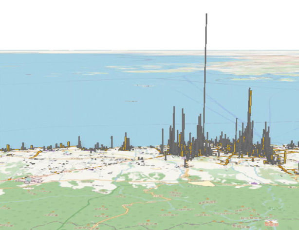 본 연구는 1㎞ 격자 단위로 카드 빅데이터를 분석하였는데 동일 읍·면·동이라 할지라도 코로나 19가 창궐했던 2월을 기준으로 매출이 증가하는 곳이 존재한다는 것을 관찰할 수 있었다. 위의 <그림 9>에서 보는 바와 같이, 카드 빅데이터를 3D로 나타내면 상권의 분절화 경향을 뚜렷이 볼 수 있다.