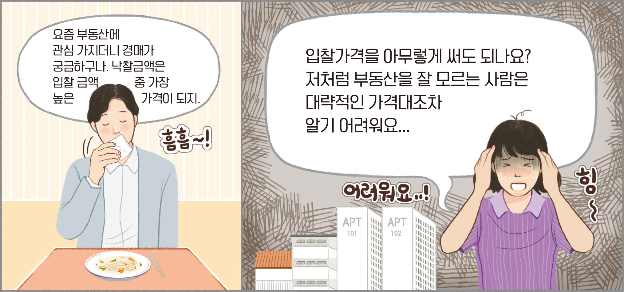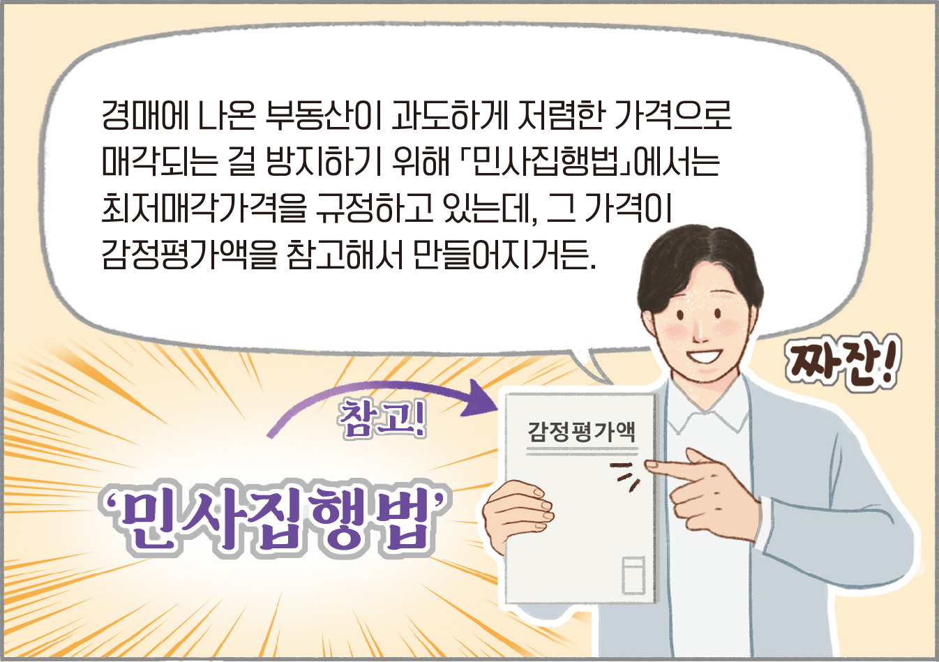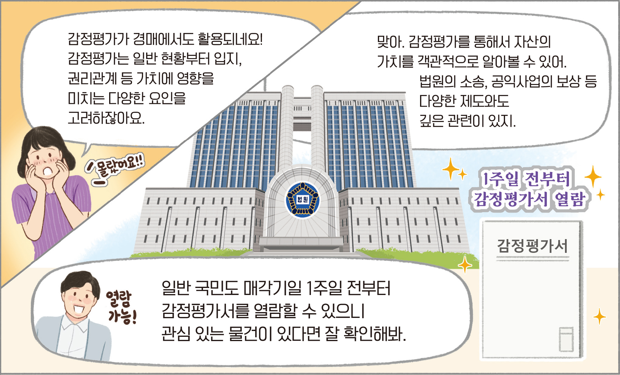 경매평가란 집행법원이 경매에서 최저매각가격을 결정하기 위해 의뢰하는 감정평가를 말합니다. 감정평가사는 법원에 평가의뢰를 받은 감정인으로서 매각할 부동산을 감정평가하고, 법원은 이를 참작하여 최저매각가격을 결정합니다. 우리 감정평가사는 법원 행정·소송 경제의 조력자로서 최선을 다하고 있으며, 앞으로도 국민 재산의 가치 수호에 힘쓰는 국가전문자격사가 되겠습니다.