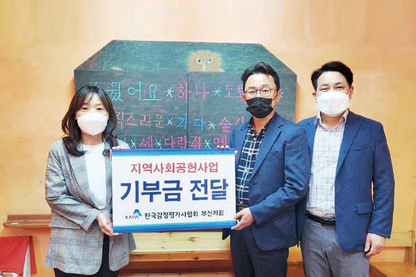 한국감정평가사협회 부산지회가 5월 가정의 달을 맞이하여 부산지역 대안학교 1곳과 재단법인 이음에 지역사회공헌사업 기부금을 전달했습니다.