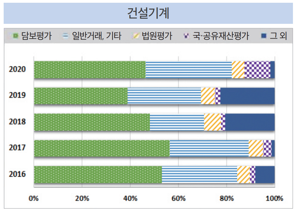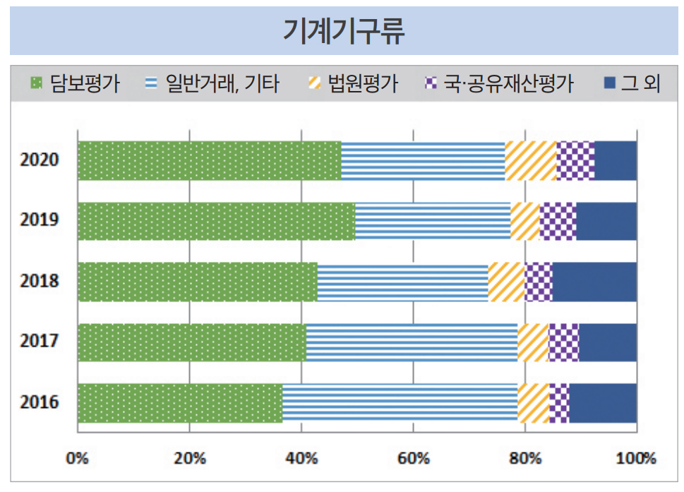 최근 5년간 기계기구류는 담보평가(약 51~97억 원, 6.7~49.7%)의 감정평가시장 규모(비중)가 평균적으로 큰(높은) 것으로 나타났다. 연도별로 살펴본 결과, 기계기구류의 담보평가 비중은 높아지는 추세지만, 일반거래·기타는 낮아지고 있다. 기계기구류 감정평가는 담보평가와 일반거래·기타가 많은 부분을 차지하지만 집중되지 않고, 법원평가, 국·공유재산평가 등 상대적으로 다양한 목적으로 감정평가가 이루어지고 있는 것으로 나타났다.