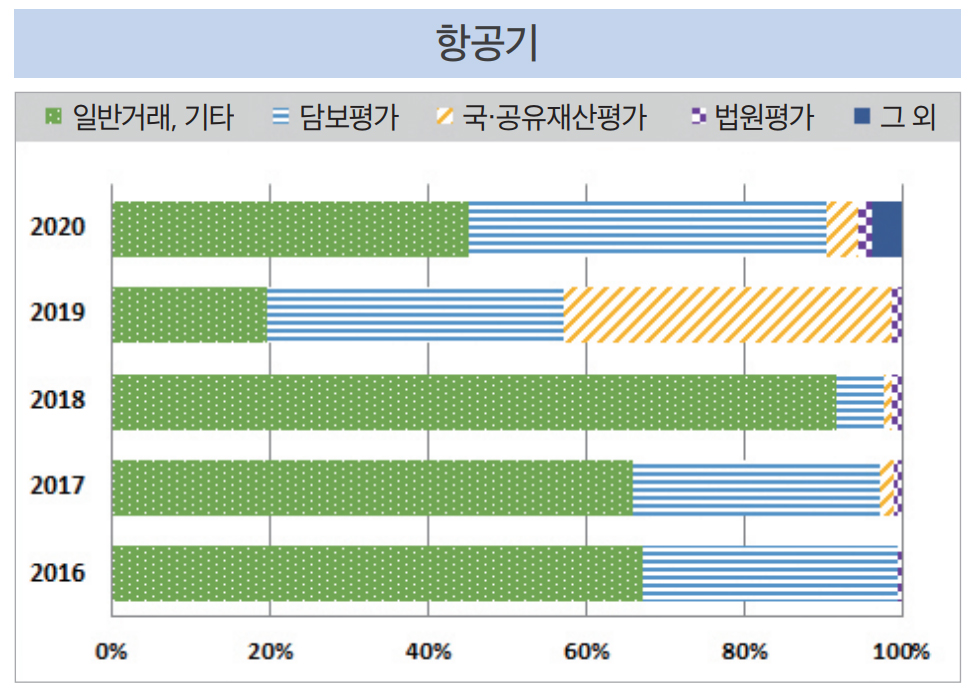 최근 5년간 의제부동산의 감정평가시장 규모 및 비중을 감정평가목적별로 분석한 결과, 의제부동산 중 자동차의 경우 법원평가(약 9억3천만 원~11억 원, 46.9~56.1%), 건설기계는 담보평가(약 12~15억 원, 38.9~56.5%), 선박은 담보평가(약 10~14억 원, 34.6~62.4%), 항공기는 일반거래·기타(약 400만 원~1억7천만 원, 19.8~91.6%)의 감정평가시장 규모(비중)가 평균적으로 큰(높은) 것으로 나타났다. 자동차의 경우 감정평가목적별로 일정한 비율의 꾸준한 수요가 있고, 건설기계는 일반거래, 국·공유재산평가의 비중이 높아지고 있는 것으로 나타났다. 선박은 담보평가, 일반거래·기타가 시장의 77.0~90.7%를 차지하고, 항공기도 일반거래·기타, 담보평가가 시장의 90% 이상(2019년 제외)을 차지하는 것으로 나타났다.