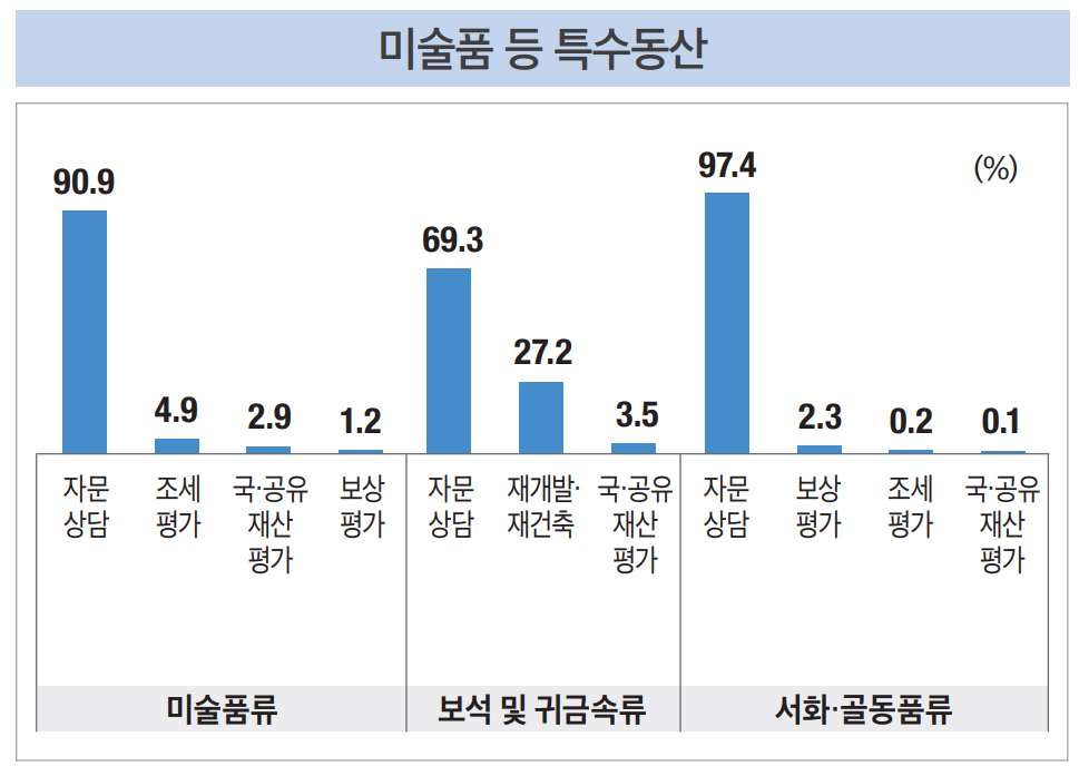 미술품 등 특수동산은 물건의 제조공정 또는 사용 목적에 따른 재고자산의 구분상 완제품(상품, 제품)에 해당하지만,14 여타의 완제품과 그 성격이 다른 특성이 있다. 즉, 미술품 등 특수동산은 가치형성요인이 일반적인 동산과는 다르고, 일반적인 시장에서 빈번히 거래되는 상품이 아니다 보니 일반적인 거래가격이 존재하지 않는 분야이다. 또한, 미술품 등 특수동산 관련 시장은 오랫동안 소수 감정기관(전문가)의 독과점 체제로 운영되어 오다 보니 폐쇄성을 가지고 있는데, 시장에 대한 이해도가 필요한 분야이다.