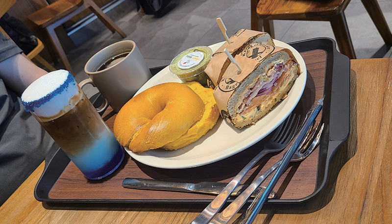 송파구 현장조사를 마치고 사무실로 복귀하는 길이었습니다. 오전에도 길게 줄이 서 있는 가게가 보여서 가까이 가보니 빵집이더라고요. 출출한 참에 아침 겸 점심으로 간단히 먹으러 가게에 들어갔습니다. 베이글을 주문해서 한 입 먹자마자 눈이 확 뜨였습니다. 쫄깃한 베이글, 풍부한 맛의 크림치즈, 그리고 시즌별로 나오는 특이하고 예쁜 커피…. 현장조사 후에 잠깐 쉬러 들어갔다가 행복한 브런치를 경험하고 왔습니다.