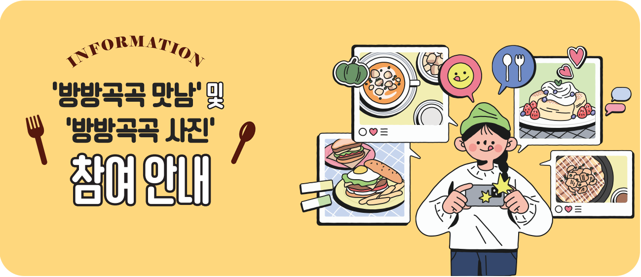 감정평가 현장조사 중 만난 맛집 소개 또는 현장 사진 소개로 이루어지는 ‘방방곡곡 맛남’ 또는 ‘방방곡곡 사진’ 콘텐츠에 여러분의 이야기를 들려주세요!
